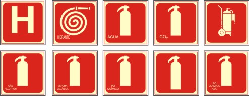 As imagens abaixo representam as placas de sinalização fotoluminescente para equipamentos de combate a incêndio: