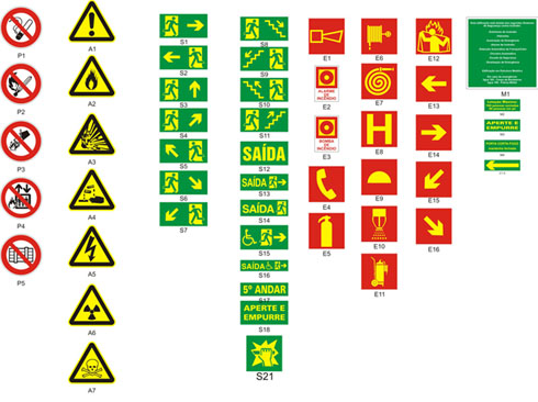 Abaixo as placas de sinalização para áreas, riscos, rotas de fuga, alarme contra inc êndio, etc: